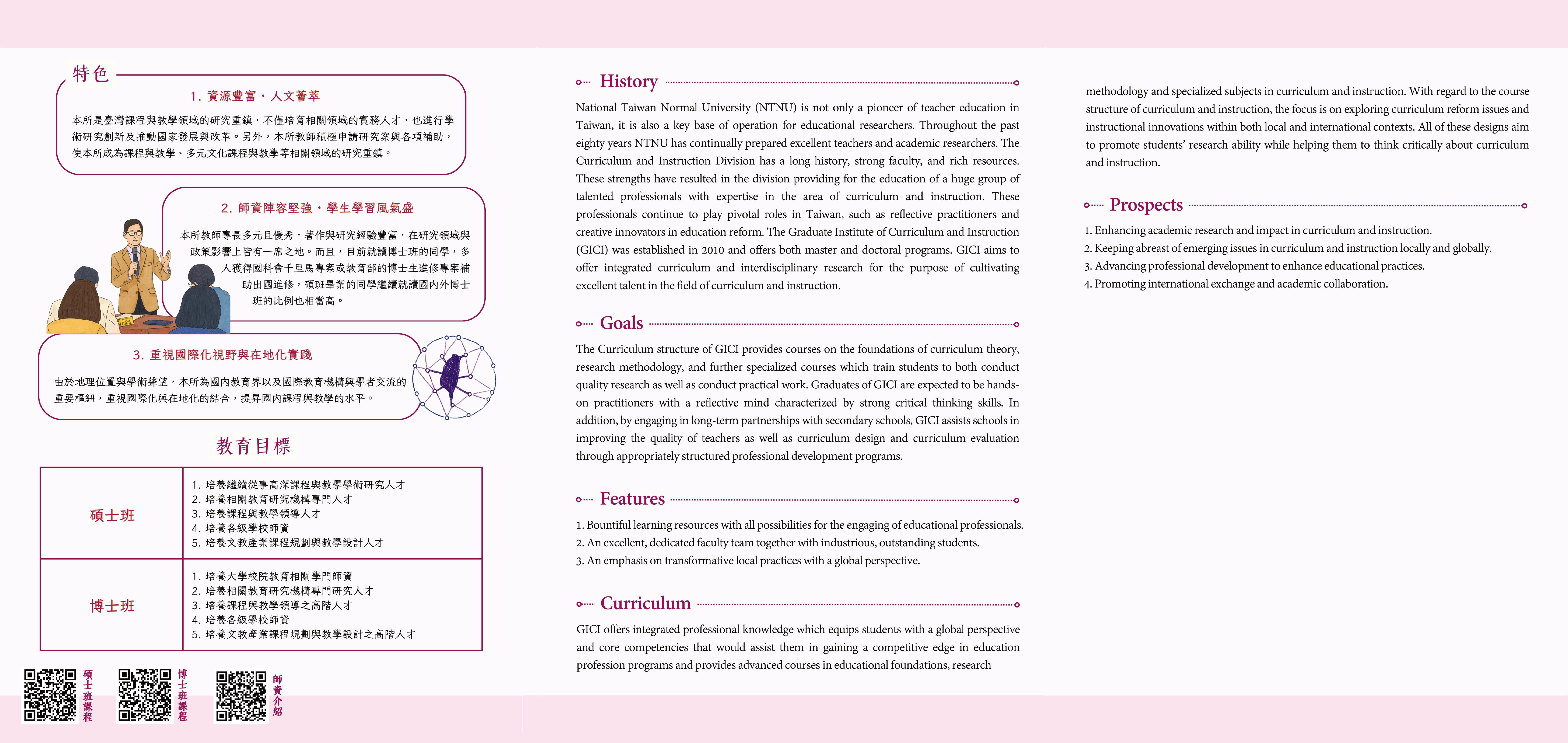 GICI Offers integrated professional knowledge which equips students with a global perspective and core competences that would assist them in gaining a competitive edge in education profession. Both Mater and Ph.D. programs provide advanced courses in educational foundations, research methodology, and specialized subjects in curriculum and instruction. With regard to the course structure of curriculum and instruction, the focus is on exploring curriculum reform issues and instructional innovations within both local and international contexts. All of these designs aim to promote students’ research ability while helping them to think critically about curriculum and instruction.